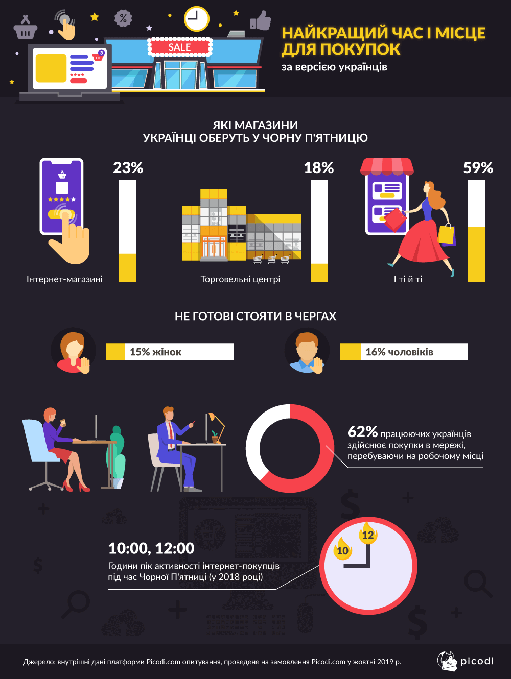 Інтернет-користувачі здійснюють покупки без черг і в зручний час. 67% опитаних українців зізналися, що займаються онлайн-шопінгом на роботі. Це підтверджується також статистичними даними Picodi.com про торішню Чорну п’ятницю — пік купівельної активності припав тоді на 11:00 і 12:00.
