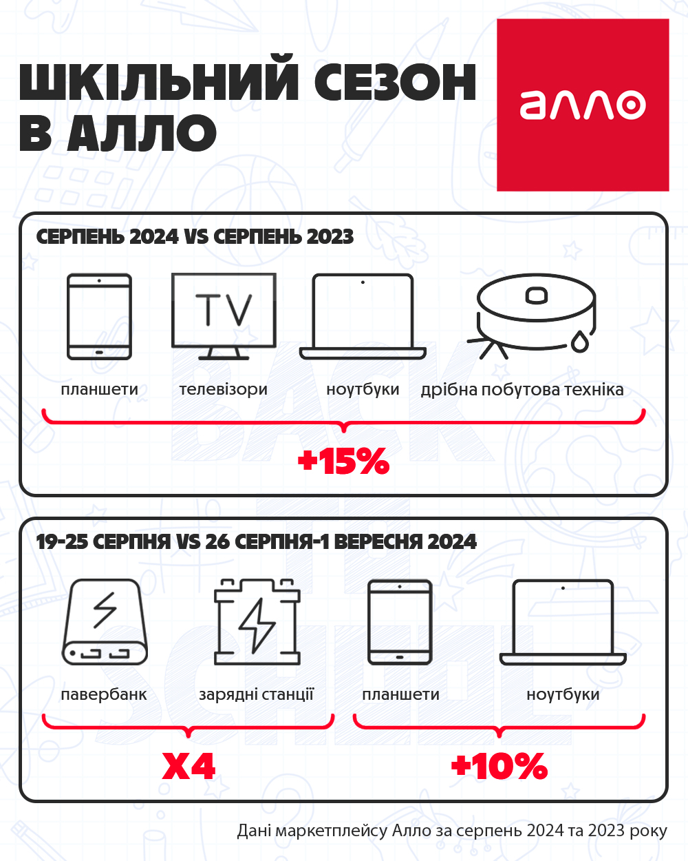 Пік закупів товарів до школи в Алло припав на кінець літа. За результатами останнього тижня серпня, продажі павербанків та зарядних станцій зросли в 4 рази, а продажі планшетів та ноутбуків – на 10% проти попереднього тижня. Загалом у серпні продажі планшетів, телевізорів, ноутбуків та дрібної побутової техніки зросли на понад 15% проти показників серпня 2023 року. А от середній чек залишився майже таким самим, як і в цей же період минулого року.