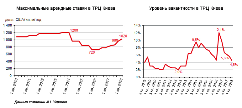 Що цікаво, аналітики фіксують відносно невелике зростання ставок в останні роки. За інформацією консалтингової компанії JLL за останні чотири роки (I квартал 2018-го до I кварталу 2015-го) максимальна орендна ставка в торгових центрах Києва виросла на 21% – з $840 до $1020 за кв. м в рік, не включаючи операційні витрати і ПДВ. За даними Colliers International, за останні 12 місяців в кращих торгових об’єктах України спостерігається зростання орендних ставок в середньому на 5%.