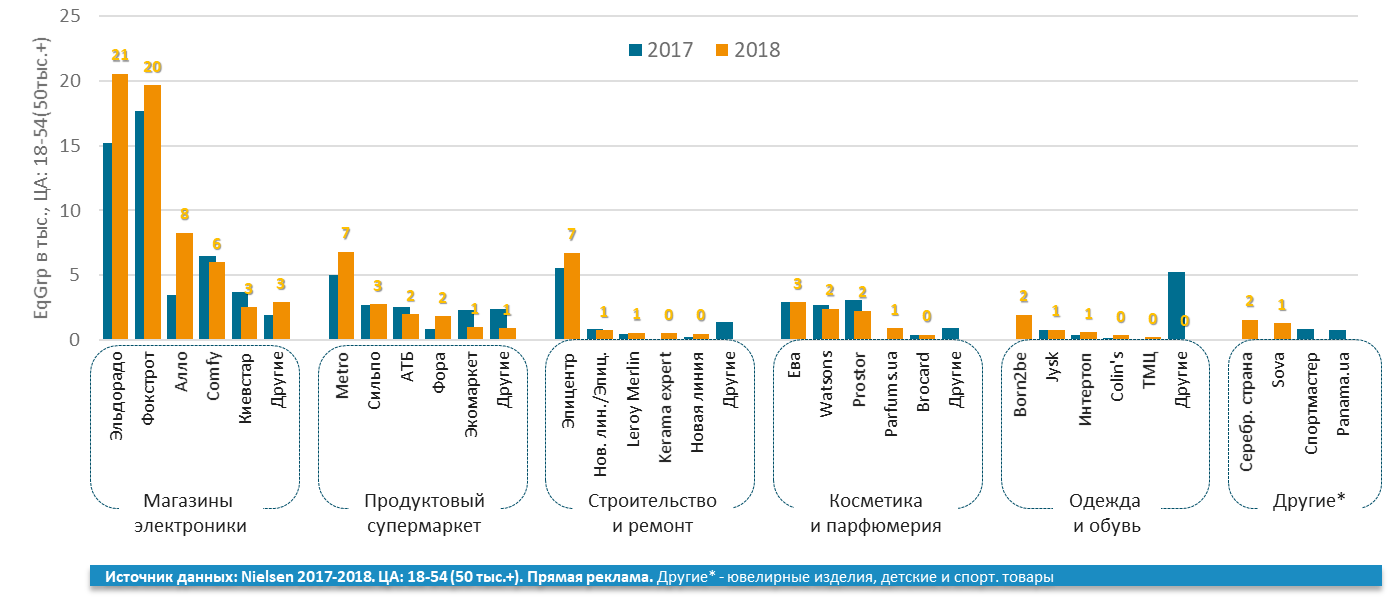 Наиболее активным рекламодателем на ТВ в 2018 году была Rozetka, которая нарастила активность на 23% и обошла традиционного лидера – Фокстрот. Но так как этот маркетплейс сейчас трудно отнести к какой-либо категории, его мы в анализе не учитывали.