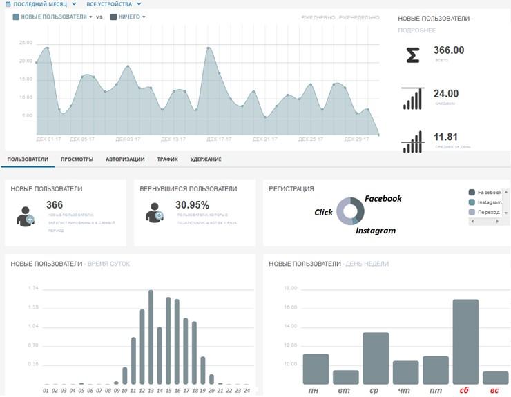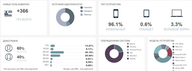 За время проведения пилота база данных клиентов пополнена данными о более чем 750 посетителях магазина. Это такие данные как имя и фамилия клиента, пол, возраст, адрес электронной почты, номер телефона, идентификатор учетной записи соцсети и др. Для регистрации в гостевой сети 55% посетителей использовали анкету, 38% предпочли Facebook, 7% – Instagram. Посетители имели возможность оценить работу магазина посредством заполнения формы обратной связи и поставить отметку «нравится» на странице АГРОМАТ в социальной сети Facebook. На рисунках 1 и 2 представлены примеры панели управления Volare с аналитическими данными.