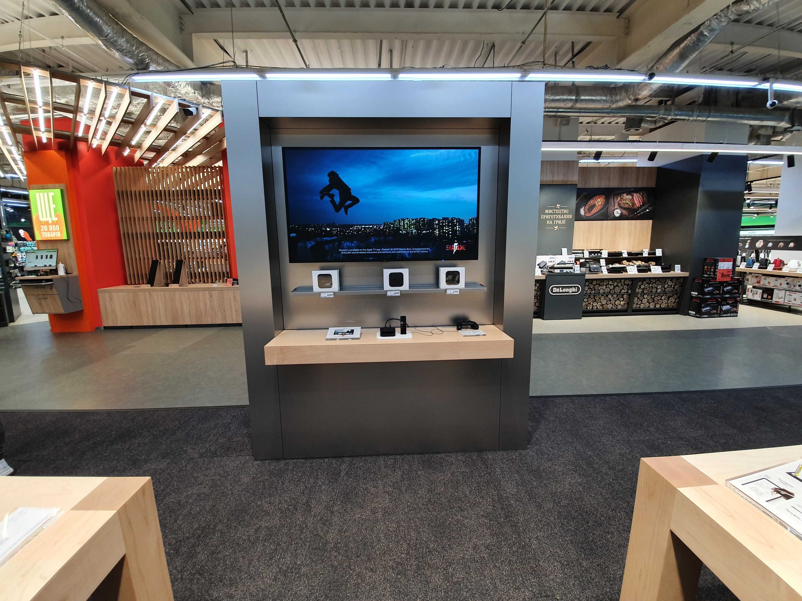 С помощью виртуальной полки покупатель может самостоятельно или с продавцом дополнительно найти и заказать любой товар или оформить доставку домой. Стоит также отметить, что в магазине есть просторная зона оформления кредитов, рядом с которой – столик для детского досуга. Ритейлер предлагает покупки с рассрочкой до 15-ти платежей.