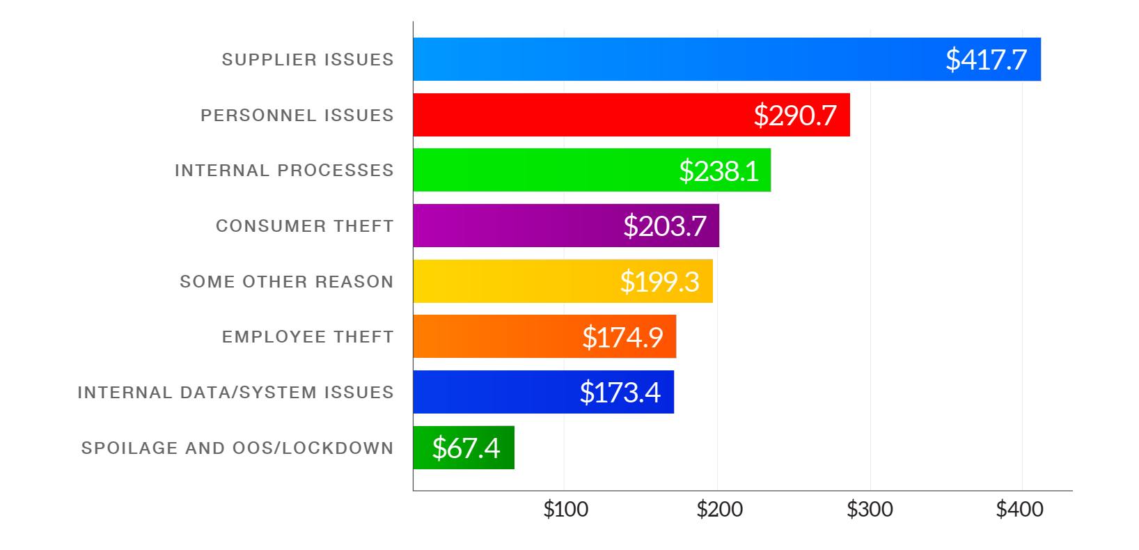 Есть много причин искажения запасов, но проблемы с поставщиками остаются основной причиной отсутствия или излишка запасов. Влияние этого фактора оценивается в $418 млрд в 2023 году, что значительно меньше прошлогодних оценок (на $174 млрд). На втором месте оказались кадровые проблемы, в том числе отсутствие обучения персонала и доверия к системам, на которые приходится еще $291 млрд. Проблемы с внутренними процессами стоят ритейлерам $239,1 млрд, а плохие системы данных создают еще $173,4 млрд. Существенный влияние также оказывают кражи – как со стороны сотрудников торговых сетей ($175 млрд), так и со стороны потребителей ($203 млрд), что составляет в общей сложности $378 млрд. Хотя проблемы карантинных ограничений отошли на последнее место, они все еще имеют место быть и оцениваются в $67, 4 млрд.