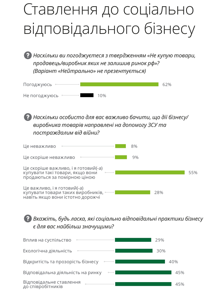 Украинцы остаются верны своим ценностям, поддерживая социально ответственный бизнес. 62% респондентов избегают компаний, не вышедших с рынка россии, а для 55% важно, чтобы бизнес помогал ВСУ. Тогда они будут охотно покупать товары таких производителей по умеренной цене, а 28% респондентов – даже по значительно более высокой цене. Наиболее принципиальными в этом вопросе украинцы в возрасте от 58 лет, а также жители Киева – доля тех, кто поддерживает такую позицию, выросла с 38% в 2023 году до 52% в 2024-м.
