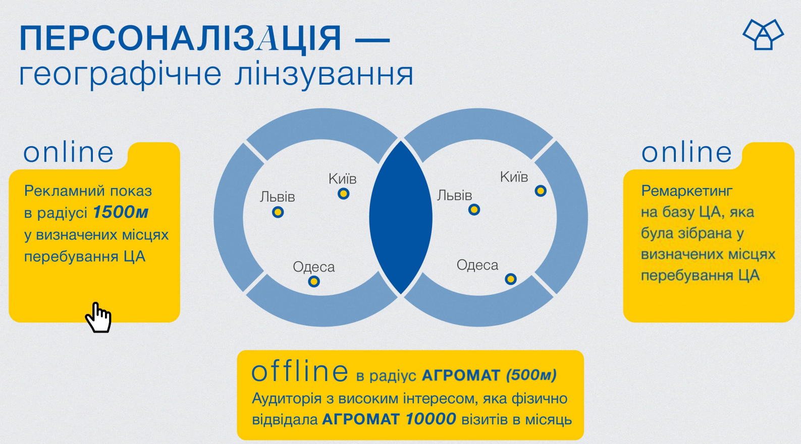 Еще мы используем географическое линзирование – целенаправленный таргетинг на территории, где мы считаем, что есть наша целевая аудитория.