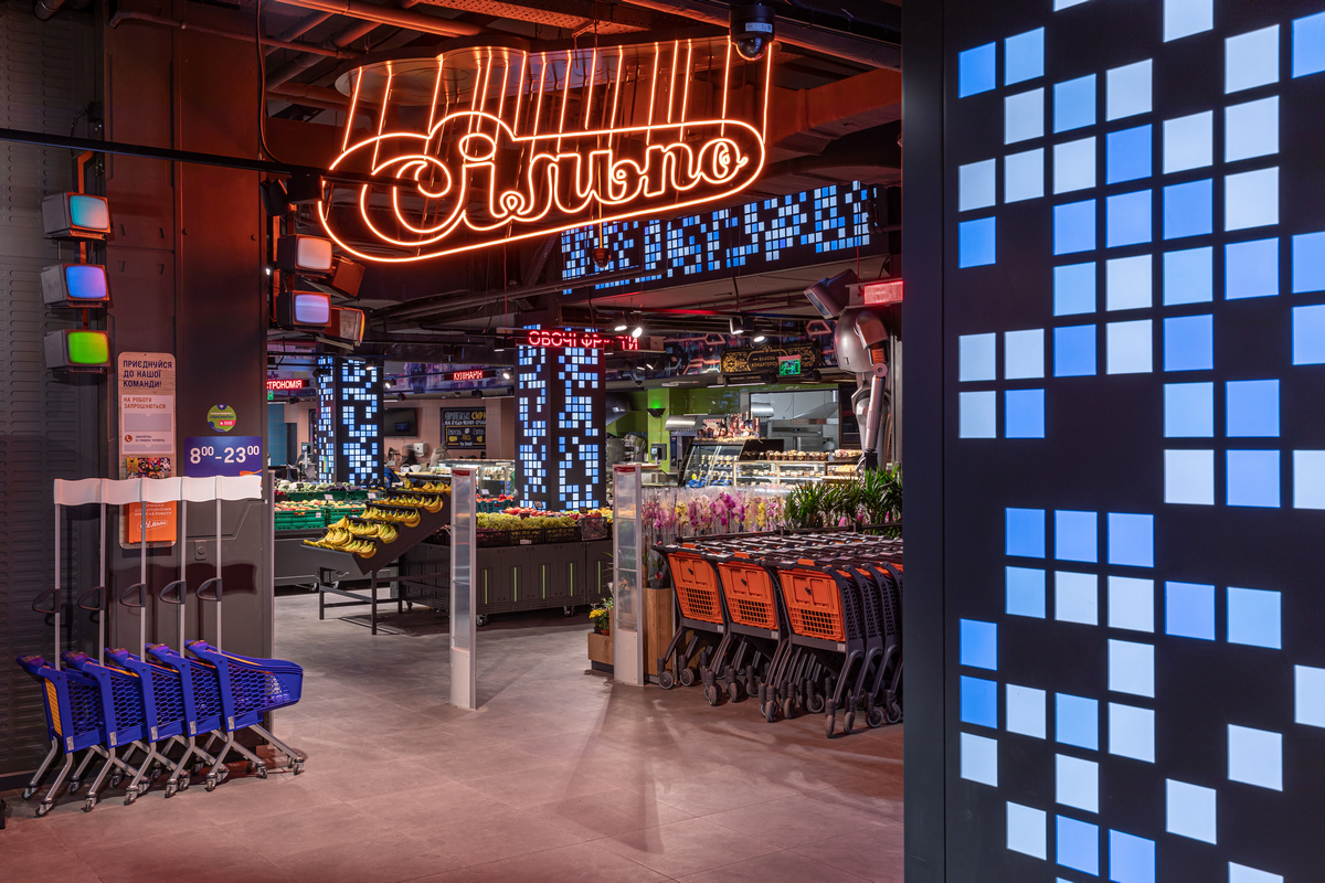 Оформление магазина сделано в стиле компьютерной эры будущего. На входе зайти внутрь приглашает технологическая вывеска Сільпо.