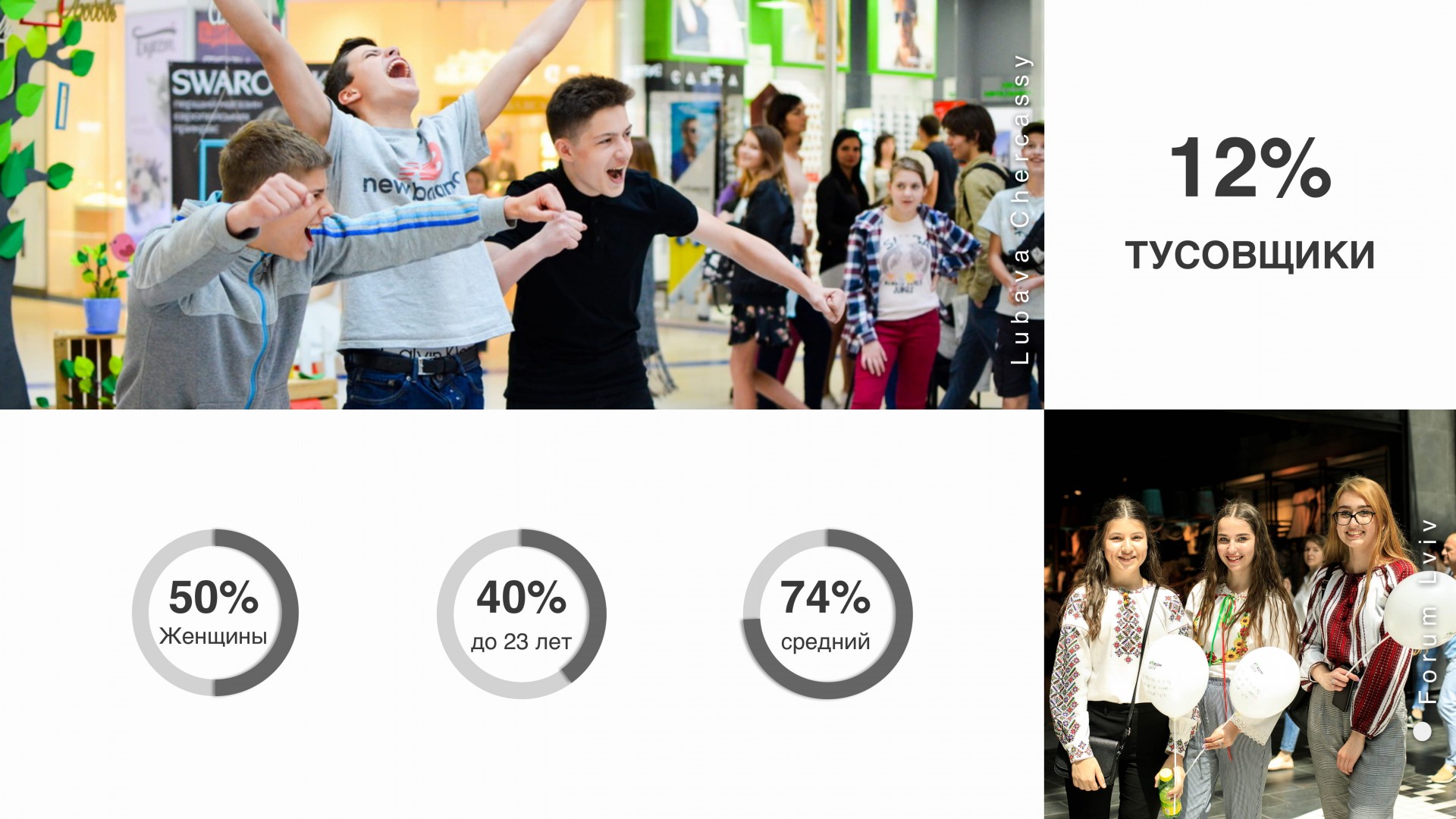 «Тусовщики» — самая молодая и очень активная в торговом центре группа — таких людей порядка 12%. Они отличаются от предыдущей группы «гурманов» тем, что тратят не только на еду, но еще и на развлечения – в общем около 70% потраченных денег. Также эта группа пребывает в ТРЦ дольше всего – примерно 2,5 часа, участвует в ивентах, очень активна онлайн и любит посещать ТЦ в выходные.