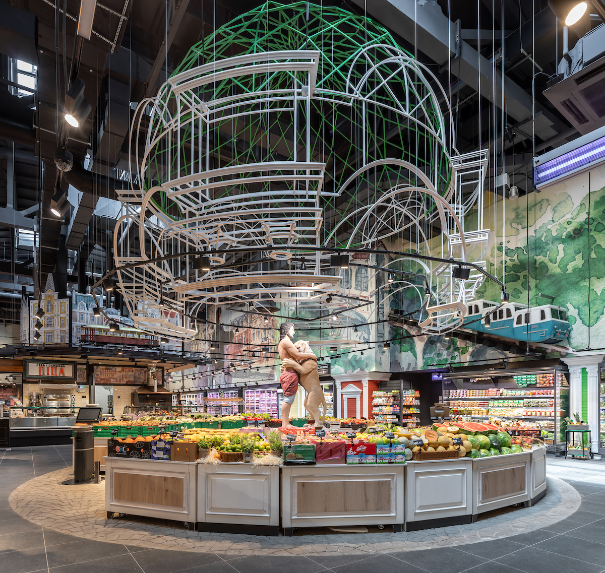 В торговом зале гостей встречает беседка с Самсоном и львом. Но в отличие от знаменитого фонтана «Самсон» на Контрактовой площади герои скульптуры не враждуют, а обнимаются. Рассказ об истории дружбы Самсона и льва продолжается на стенах супермаркета: они ловят рыбу, посещают Киево-Могилянскую академию, пьют вино с Тарасом Шевченко, ездят на красном запорожце, едят пирожки в кафе и пьют квас из больших желтых бочек. Почитатели Подола узнают Житний рынок, где лев покупает мясо, а также характерные подольские домики и их жителей, гуляющих по улицам. В современной части этой истории герои ходят в барбершоп, ездят на скейте и самокате, едят бургеры и делают селфи.