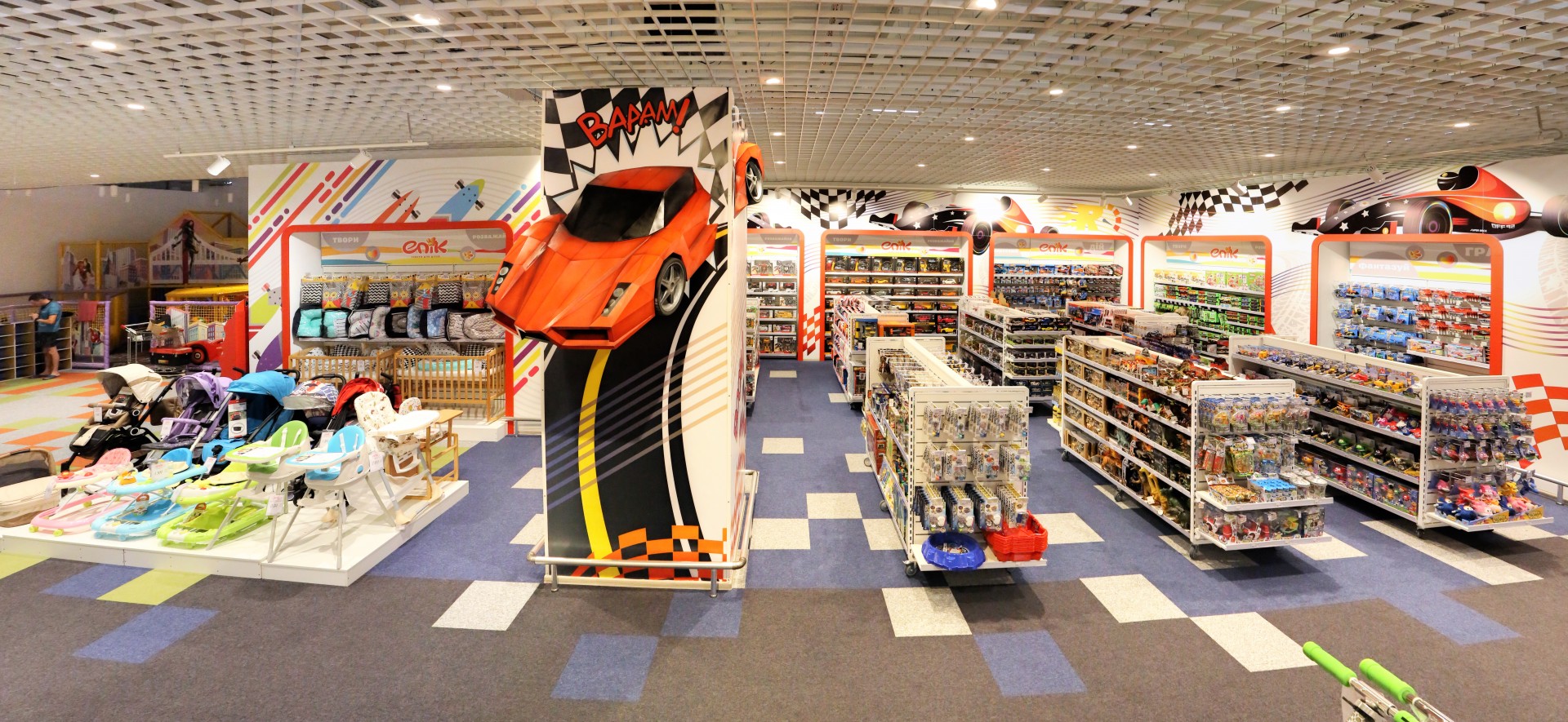 Магазин детских товаров Эпик занимает площадь 1700 кв. м, и предлагает не только лучшие товары для детей, но и зоны отдыха, творчества, батуты и другие развлечения.