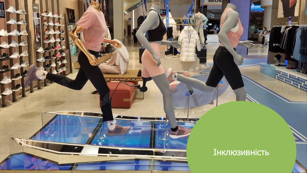 И еще один очень важный тренд – это инклюзивность. Для Украины это очень важная история, уже сейчас мы видим на улицах людей с ограниченными возможностями, без конечностей. Поэтому когда крупные известные бренды как Adidas в своих торговых залах ставят манекены с протезами – это также является частью культуры инклюзивности и влияет на развитие сознания общества и создание лучших условий жизни для людей с ограниченными возможностями. Тем более, что для Украины из-за войны – это новая нормальность.