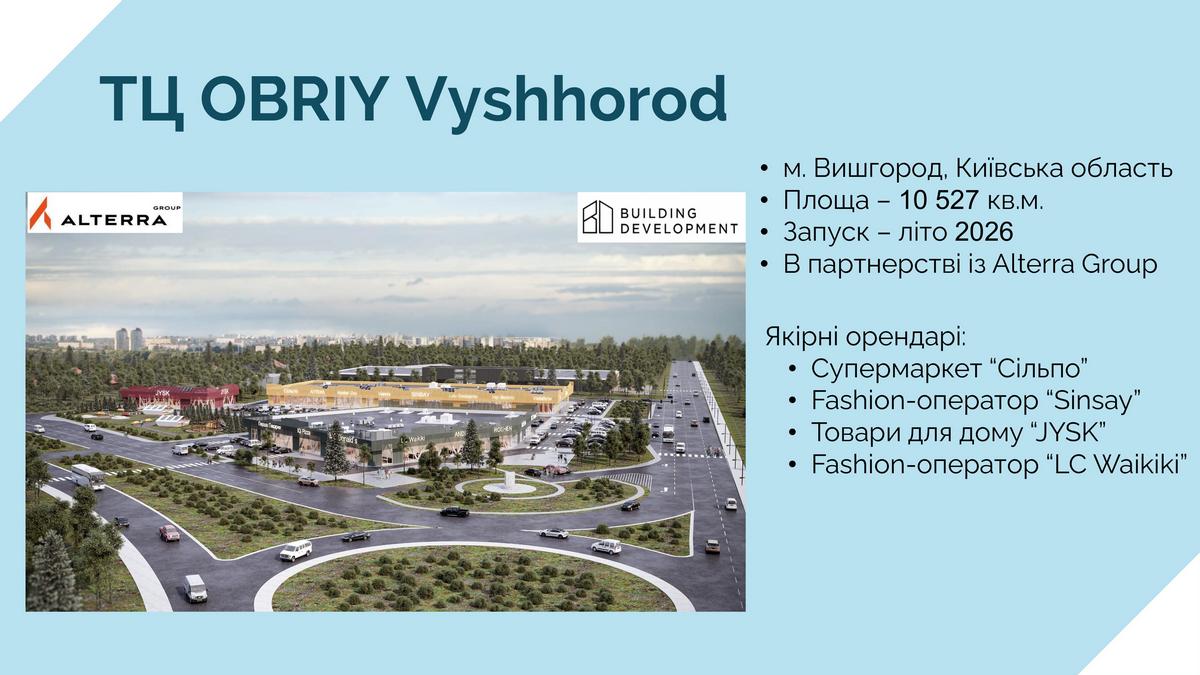 Компания Building Development вместе с Alterra Group создает сеть многофункциональных торговых центров в формате «ритейл-парк». Первым таким общим проектом стал ТЦ Obriy Trypil в городе Украинка в Киевской области, открытый в феврале 2025 года. Это небольшой ТЦ площадью 3500 кв. м, построенный сразу с бомбоубежищем (300 кв. м) и паркингом на 75 машиномест. Фактически он сочетает в себе два классических формата – обычного торгового центра и ритейл-парка.