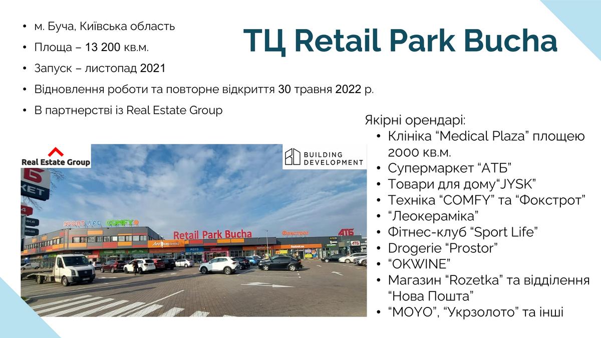 Идея создания сети ритейл-парков возникла в 2019 году, а ее реализация состоялась через два года – в ноябре 2021-го, когда был открыт ТЦ Retail Park Bucha в городе Буча Киевской области. Этот классический ритейл-парк площадью 13200 кв. м. был возведен в партнерстве с Real Estate Group.