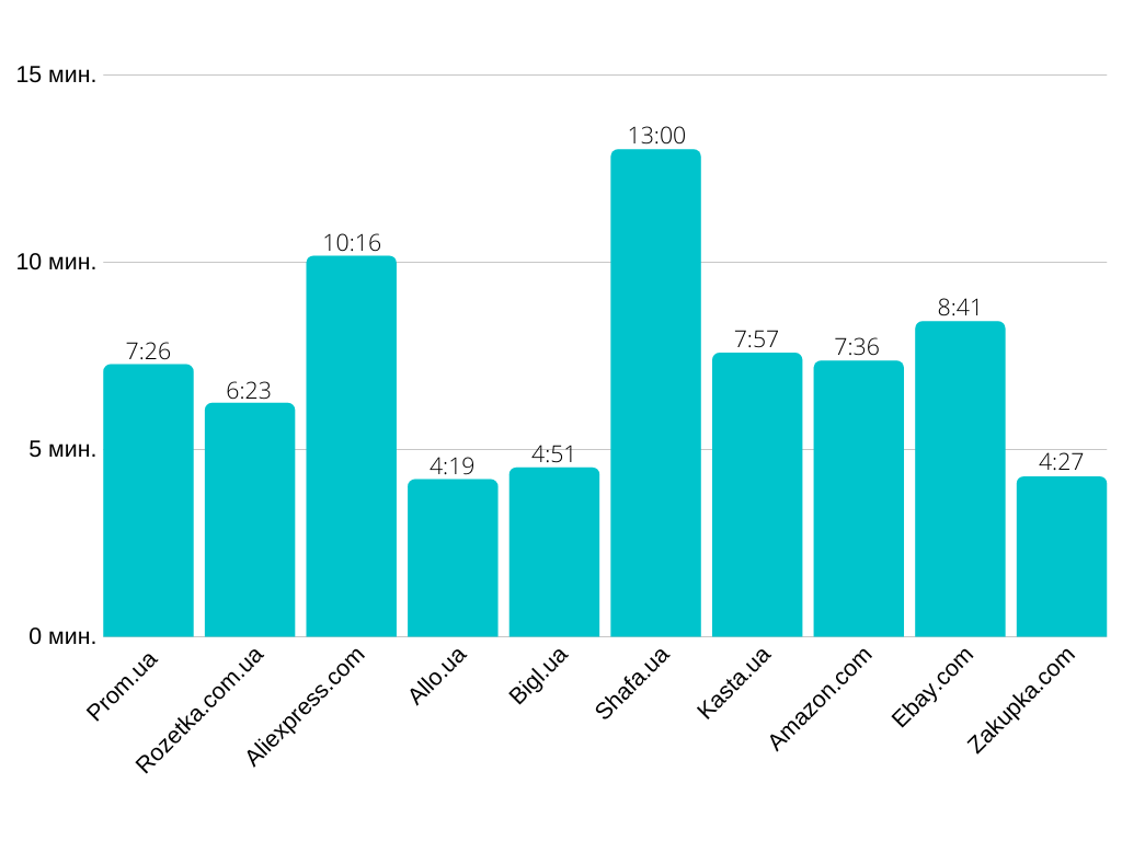 Больше всего времени пользователи проводили на сайте Shafa.ua — 13 минут. Для сравнения: один сеанс на веб-версии Facebook в 2019 году в среднем длился почти 11 минут.