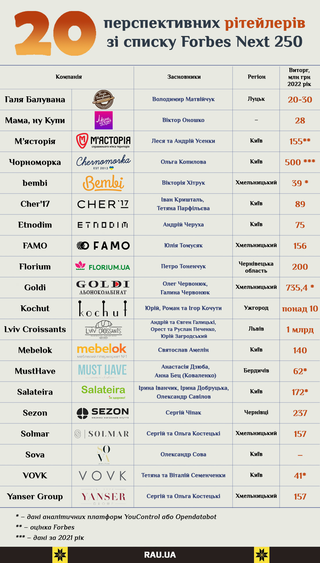 Портал RAU проанализировал список Forbes Ukraine, и выбрал из рейтинга те компании, которые связаны со сферами розничной торговли, общепита или смежными отраслями. Номинанты списка размещены в алфавитном порядке.