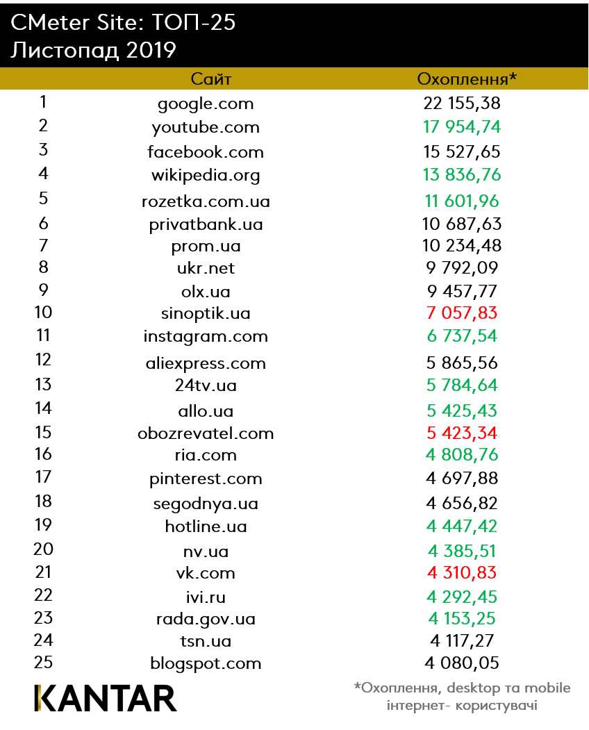 Среди магазинов, которые не вошли в рейтинг, но значительно нарастили охвата: 27.ua, Сomfy.ua, Сitrus.ua, Foxtrot.com.ua, Eldorado.ua, Kasta.ua. Hotline.ua помогал находить самые выгодные предложения и поднялся с 34-го на 19-е место. Тройка лидеров осталась неизменной, в ней по-прежнему Google, YouTube и Facebook.