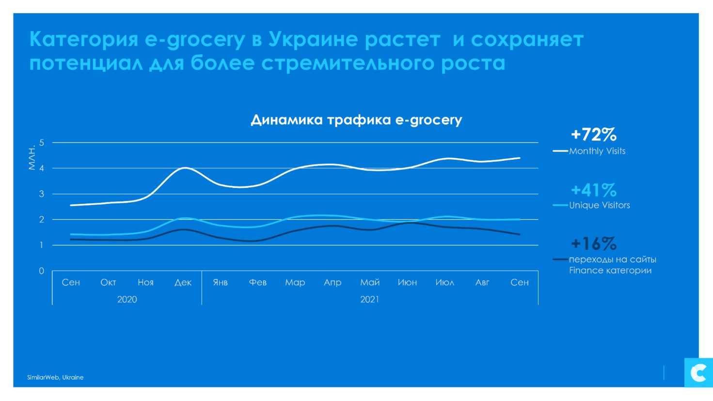 В Украине с прошлого сентября количество визитов на сайты e-grocery выросло на 72% и продолжает расти. При этом количество уникальных пользователей этой категории сайтов выросло на 41%. Количество переходов на сайты, позволяющие сделать оплату, выросло в 1,5 раза.