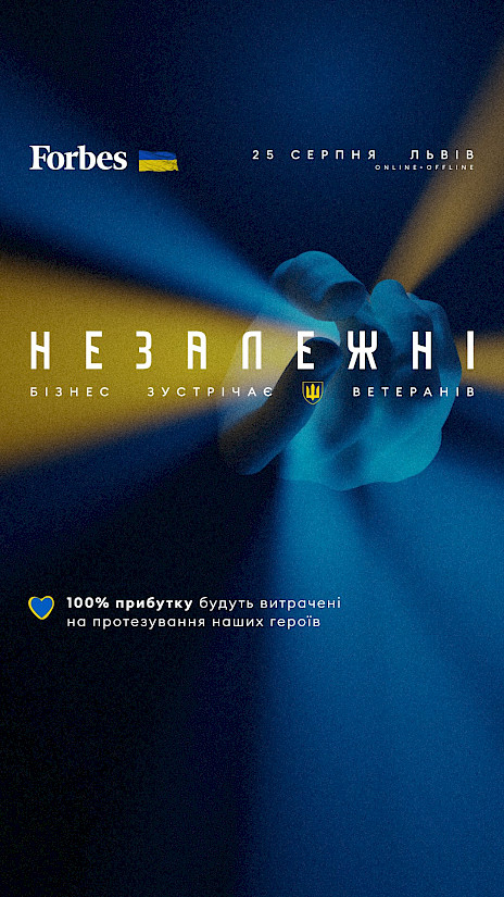 25 серпня Forbes проводить у Львові Благодійний форум «Незалежні»: бізнес зустрічає ветеранів. Вони боронять нашу незалежність, наша мета – забезпечити їх незалежність у цивільному житті. 20+ спікерів топрівня поділяться найкращими практиками: Ольга Руднєва, CEO Superhumans Center, Віталій Седлер, CEO Intellias, Андрій Садовий, голова Львівської міської громади, а також інші лідери корпоративного та державного сектору.