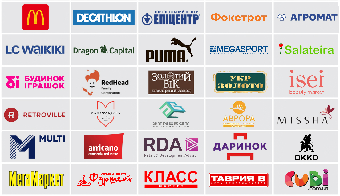 LC Waikiki, Epicenter, McDonalds, Decathlon, Puma, Megasport, Foxtrot, Agromat, Ukrzoloto, Zolotoy Vek, Apteka 911, Antoshka, Budynok Іgrashok, ISEI, Missha, RDA, Arricano, Manufactura, Arena, Darynok, Multi Ukraine, SEC Victory Plaza, SEC Aurora, Tavria B, Megamarket, Furshet, OKKO, Klass, Salateira and other companies are among exhibition’ guests.