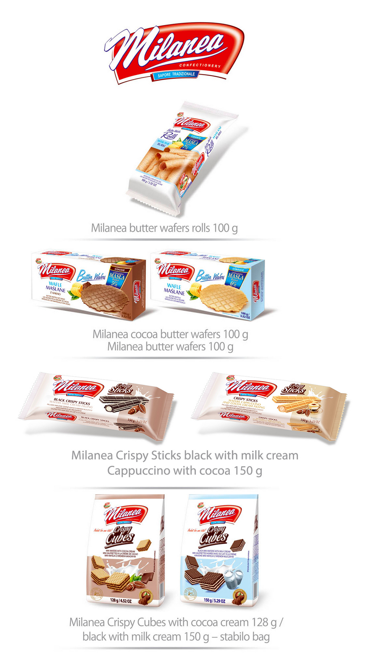 We cannot forget about wafers here, which are also appreciated by our customers in Ukraine, the most known are Milanea Crispy Sticks wafers with cappuccino cream filling and black wafers with milk cream filling, as well as Milanea Crispy Cubes – mini wafers perfect for one bite.