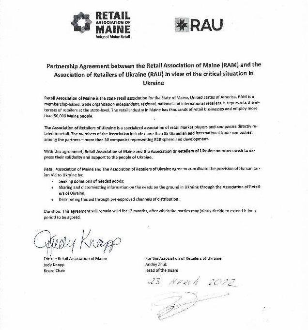 Retail Association of Ukraine and Retail Association of Maine (USA) announced the annual partnership agreement on joint efforts to provide humanitarian assistance to Ukraine from the United States (Maine).
