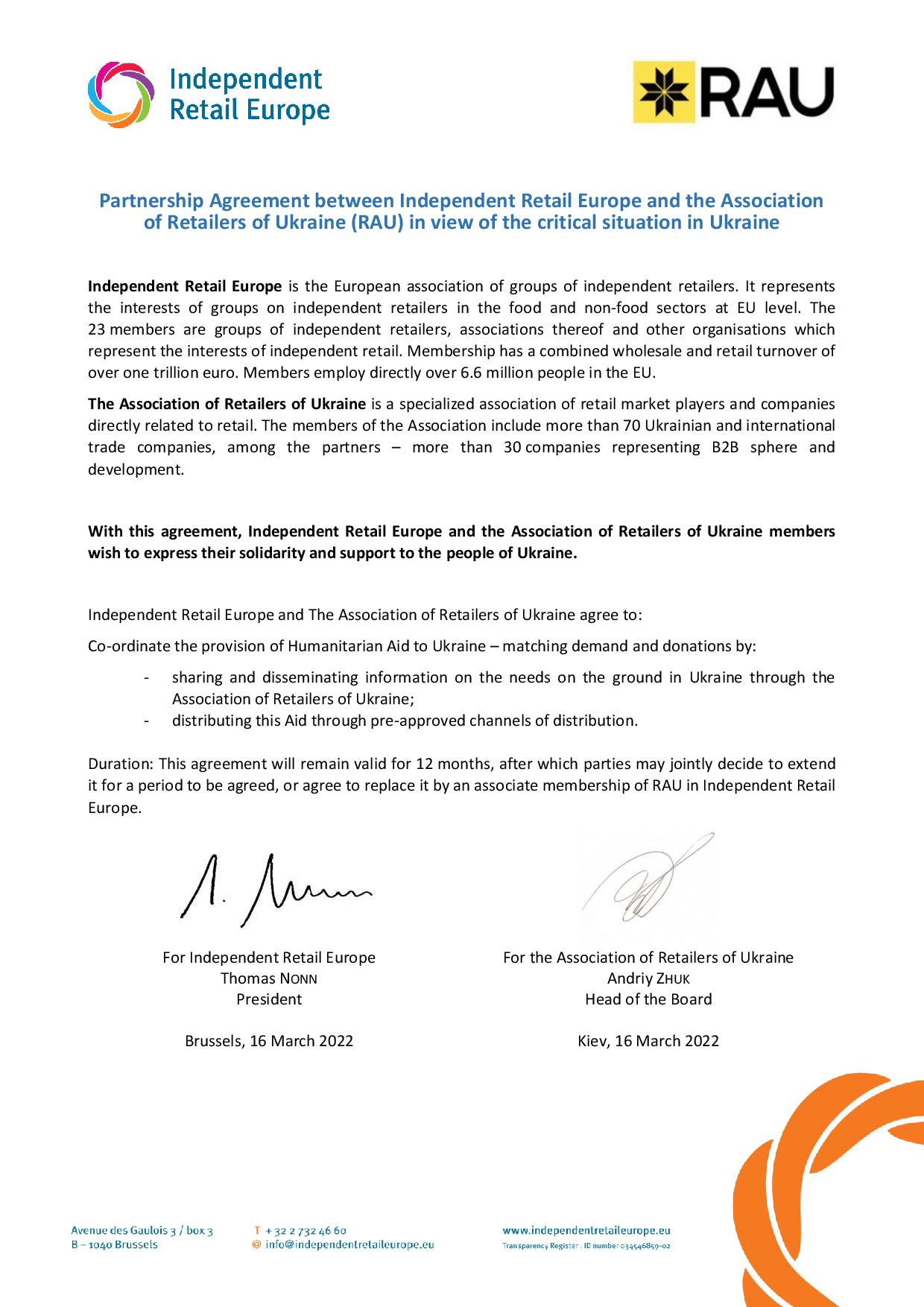 Independent Retail Europe and Retail Association of Ukraine are happy to assist any other organisation which is looking to supply humanitarian aid to Ukraine.
