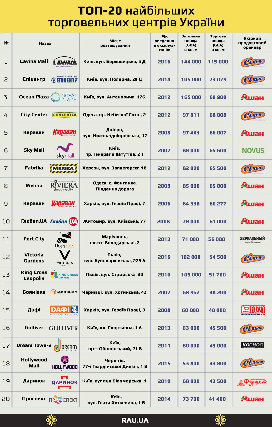 У 20-ку найбільших торговельних центрів України увійшло вісім столичних ТЦ, серед яких Lavina Mall, Ocean Plaza, Sky Mall, Проспект і Епіцентр, а також найбільші об’єкти Одеси, Дніпра, Херсона, Львова та інших міст.