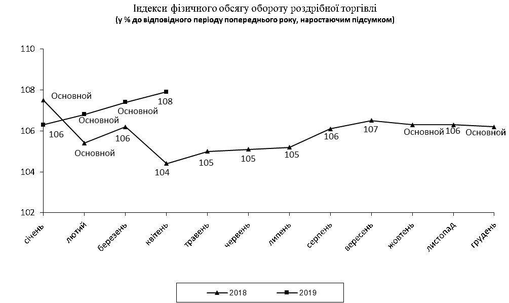 Про це повідомляє Державна служба статистики України. Як наголошується в релізі відомства, індекс фізичного обсягу обороту роздрібної торгівлі в січні-квітні 2019 року щодо січня-квітня 2018 го в порівнянних цінах склав 107,9%.