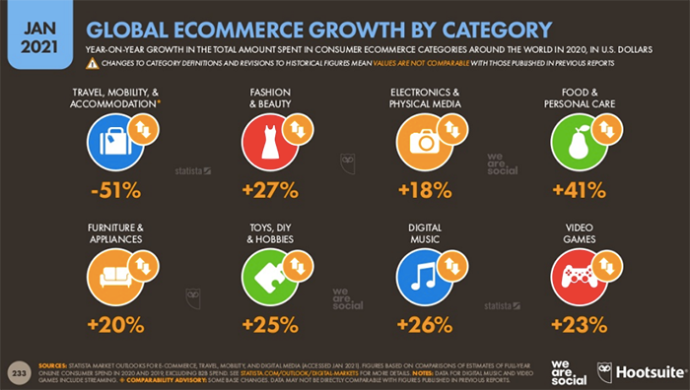 У 2020 році онлайн-витрати в секторі туризму і проживання скоротилися на 51%, до $593,6 млрд. У категорії «мода і краса» онлайн було витрачено $665,6 млрд (+27% г / г). Сектор продуктів і засобів гігієни виріс на 41%, до $413,8 млрд. Онлайн-продажі меблів і товарів для дому виросли на 20%, до $330,9 млрд, а іграшок, товарів для хобі і рукоділля – на 25%, до $525,6 млрд.