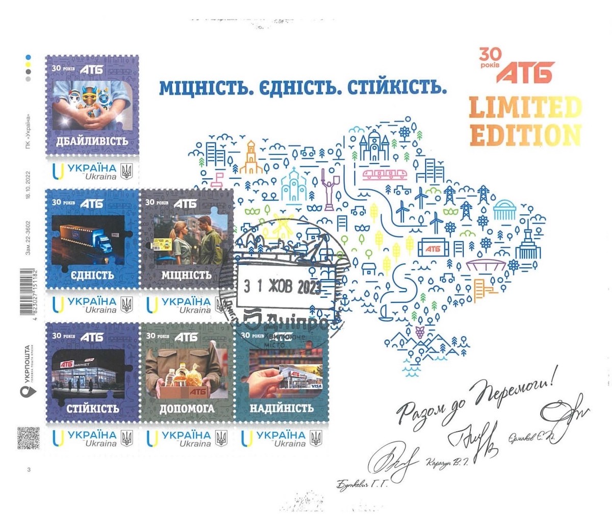 До тридцятої річниці компанії у співпраці з Укрпошта було створено спеціальну лімітовану серію марок. Кожна з них розроблена з великою увагою до деталей та з відображенням головних рис АТБ та народу. Також на марках надруковано головні слогани сьогодення: «Стійкість», «Допомога», “Міцність», «Дбайливість», «Єдність», «Надійність».
