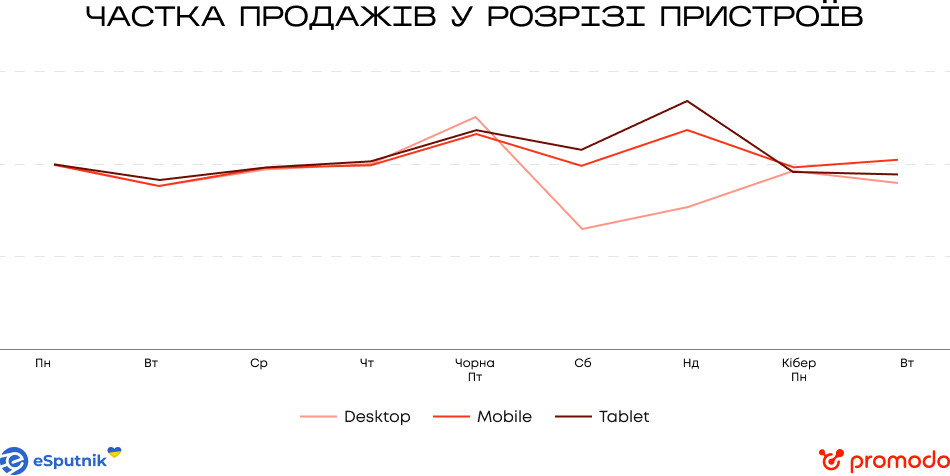 Частка покупок зі смартфонів у листопаді зросла з 75% до 78% порівняно з минулим роком. Але в дні пікового попиту вона тимчасово зменшувалася. На вихідних — навпаки, показник підіймався до максимальних значень.
