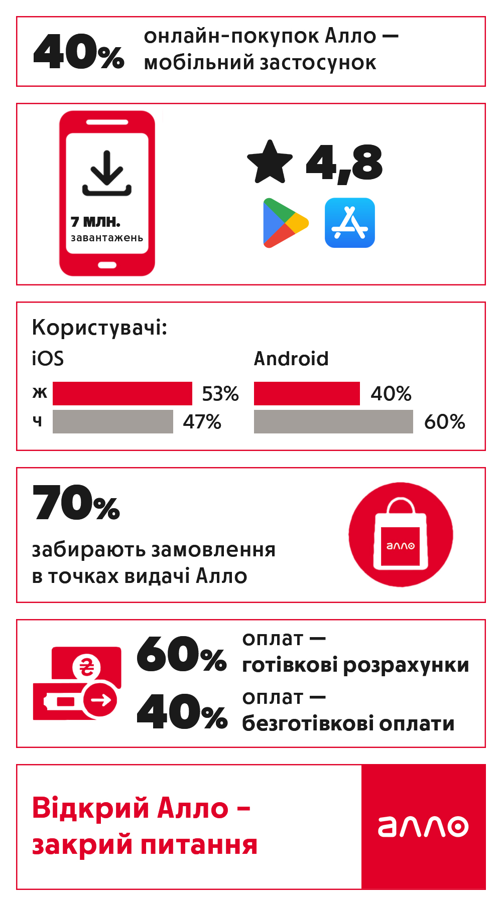 Частка онлайн-продажів на маркетплейсі Алло зростає рік до року завдяки популярності мобільного застосунку. На кінець 2024 року 40% всіх онлайн-покупок на маркетплейсі припали саме на нього. Загалом користувачі завантажили застосунок Алло понад 7 мільйонів разів, залишивши схвальні відгуки і оцінивши його в App Store та Google Play на 4,8 балів.