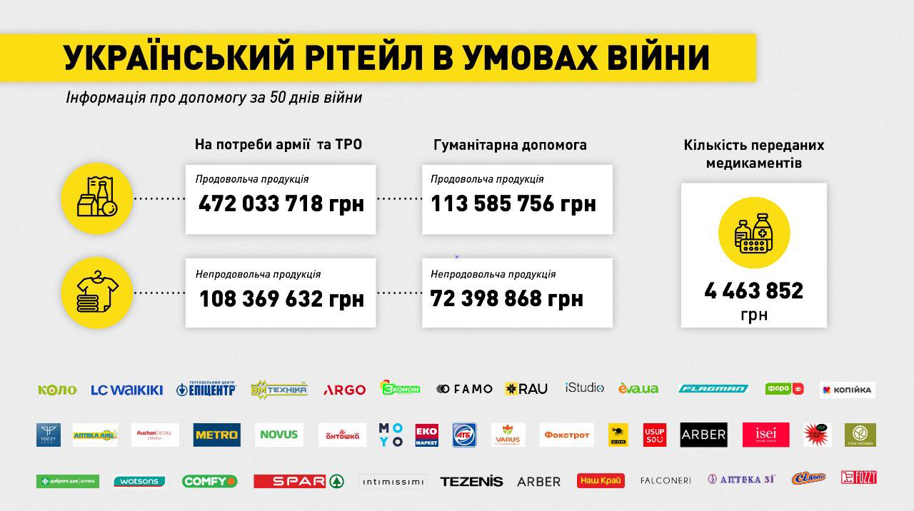Станом на 14 квітня українські рітейлери передали на потреби армії та територіальної оборони продовольчої продукції на суму близько 472 млн грн. Ще на 113,6 млн грн було передано гуманітарної допомоги. Непродовольчої продукції було поставлено на суму 108,4 млн грн для армії та ТрО та 72,4 млн грн – гуманітарки.