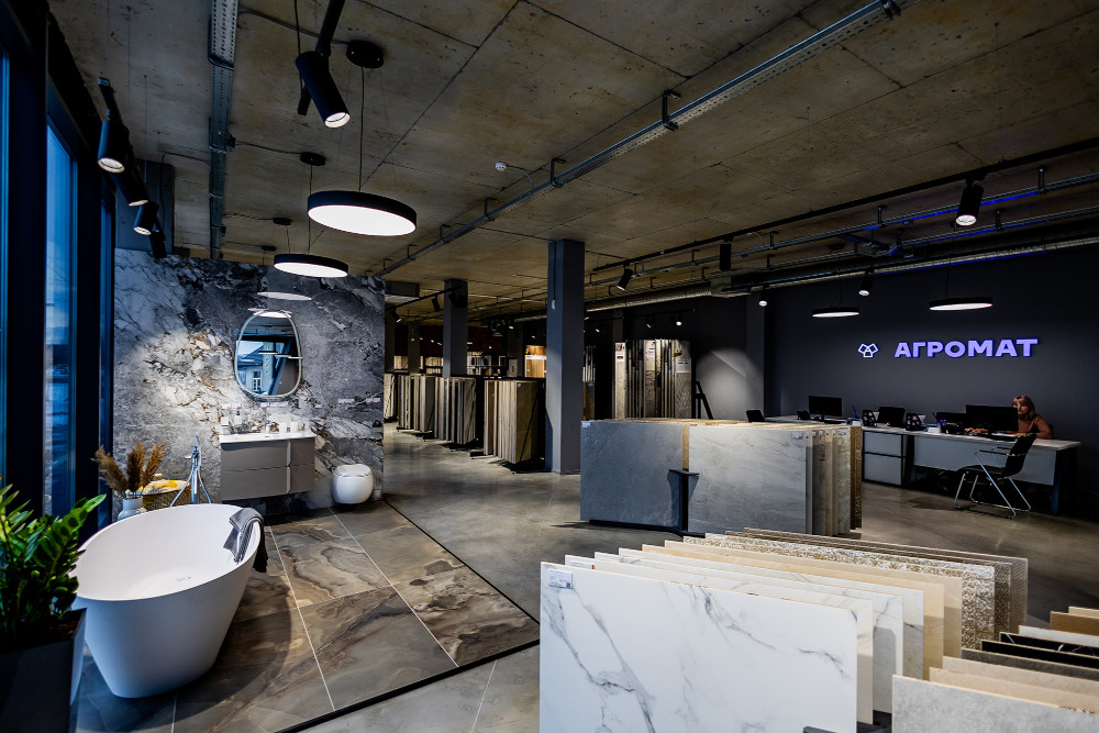 Довідка. Агромат — національна мережа магазинів плитки та сантехніки. Заснована в 1993 році та нараховує 30 магазинів в 17 містах України. Найбільший магазин, площею 16 000 кв. м, розташований у Києві на вул. Академіка Булаховського, 4. https://www.agromat.ua/