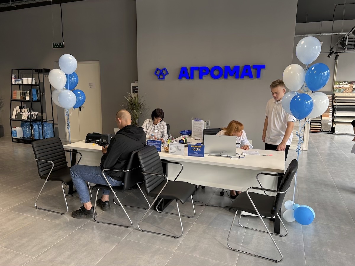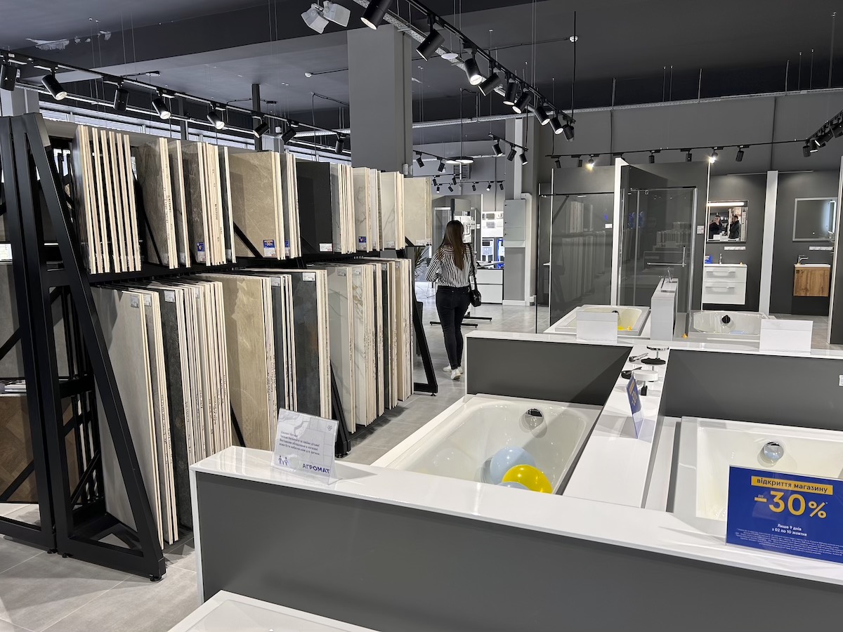 Новий Агромат у Чернігові має загальну площу 400 кв. м. Тут можна придбати сучасну плитку, сантехніку та підлогові покриття від світових та українських брендів, а ще меблі та аксесуари для ванних кімнат та супутні товари для ремонту. З нагоди відкриття магазин пропонує покупцям знижки до 30% на товари для ремонту осель.