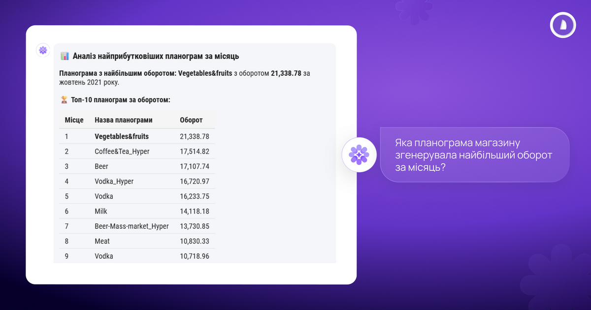 - Директору магазину - оперативні відповіді по його точці: запаси, викладка, проблемні SKU, виконання планів, порівняння з іншими магазинами.