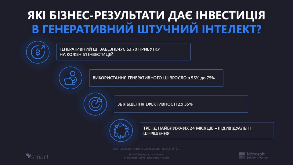 Генеративний ШІ — це про стратегічну віддачу, а не про експерименти. За глобальними оцінками, кожен $1 інвестицій повертає $3.70. Компанії, які вже інтегрували ці рішення, фіксують до 35% зростання ефективності операцій та управлінських процесів.