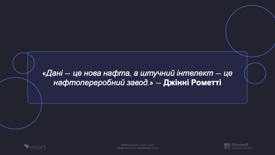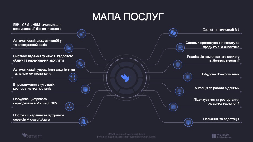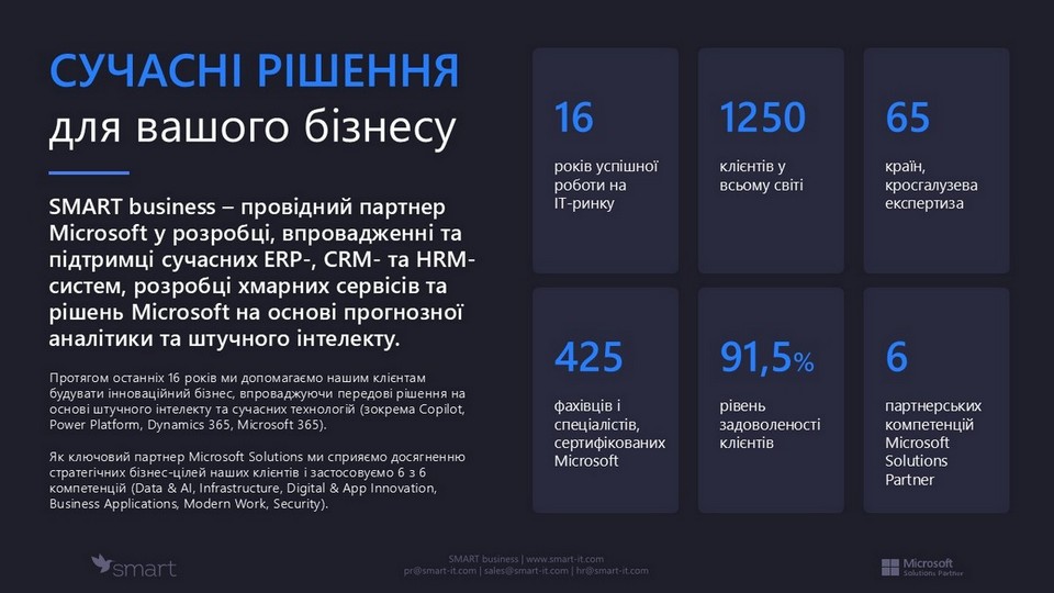 SMART business є провідним партнером Microsoft у розробці та впровадженні комплексних бізнес-систем, таких як ERP-, CRM-, HRM-системи, а також хмарних сервісів та інноваційних AI-рішень. Один з напрямків діяльності компанії – створення рішень на основі штучного інтелекту для ефективного використання даних, ресурсів та робочих процесів. Загалом у компанії більше 1250 клієнтів у 65 країнах світу, що свідчить про її кросгалузеву експертизу та глобальний вплив.