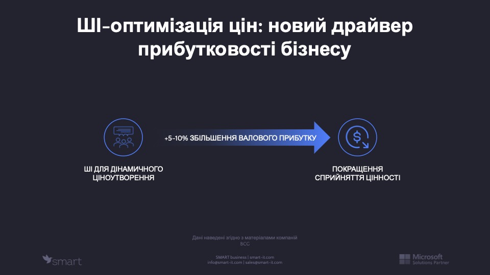 - Оптимізація ціноутворення – SMART Price Insights: ШІ-алгоритми на основі поведінки клієнтів, даних щодо конкурентів, цінової еластичності та бізнес стратегії компанії пропонують оптимальну ціну в режимі наближеного до реального часу. ШІ-оптимізація цін може збільшити валовий прибуток до 10%.
