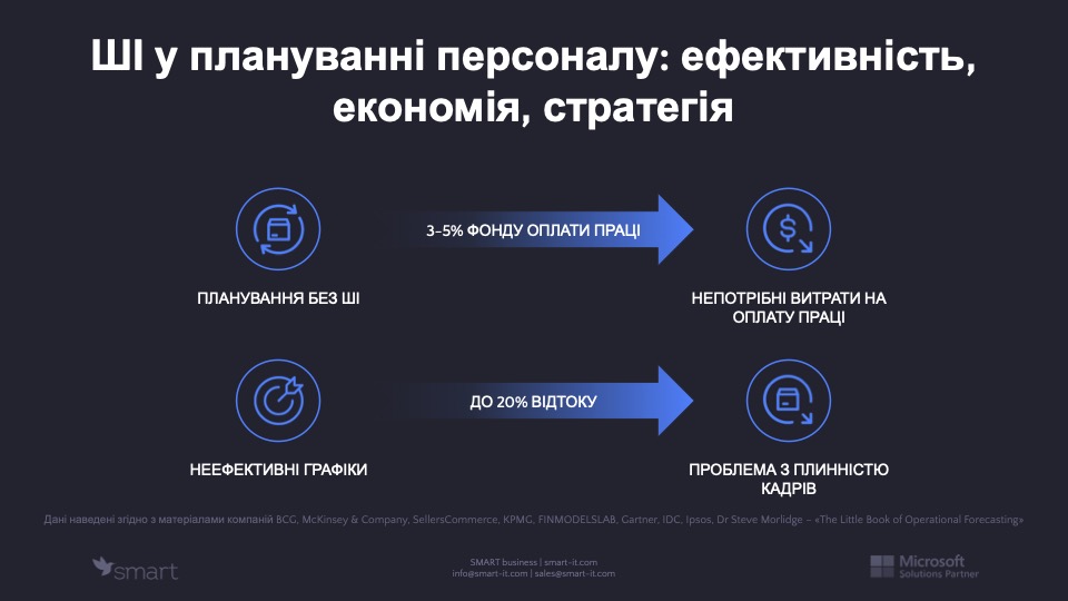 - Планування персоналу – SMART Flexi Scheduler: На основі прогнозів попиту та очікуваної інтенсивності операцій ШІ-система пропонує оптимізовані графіки змін, щоб уникнути простоїв та перевантажень. Це дозволяє скоротити додаткові витрати на фонд оплати праці до 5% та зменшити плинність кадрів до 20%.