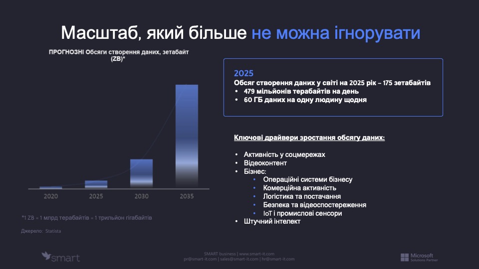 Серцем будь яких AI-моделей є дані. Світ щодня генерує колосальні обсяги інформації: цього року прогнозується створення 175 зетабайтів даних, що еквівалентно 479 мільйонам терабайтів на день, або близько 60 ГБ на одну людину щодня. Ці дані надходять з різноманітних джерел: активність у соціальних мережах, відеоконтент, операційні системи бізнесу, комерційна активність, логістика та постачання, системи безпеки, відеоспостереження та промислові сенсори.