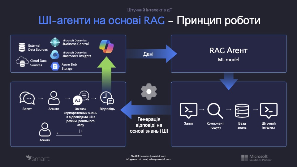 Покращення комунікації та доступу до знань. RAG-агенти (Retrieval-Augmented Generation), побудовані на основі генеративного ШІ (наприклад, Copilot), дозволяють працювати з власними чутливими корпоративними даними без ризику витоку за комерційний контур. Вони можуть консультувати співробітників, взаємодіяти з ERP та CRM-системами, надавати відповіді на основі внутрішньої бази знань. Це значно підвищує ефективність роботи всіх напрямків бізнесу: від HR і клієнтського сервісу до маркетингу, операцій та корпоративних онлайн-платформ.