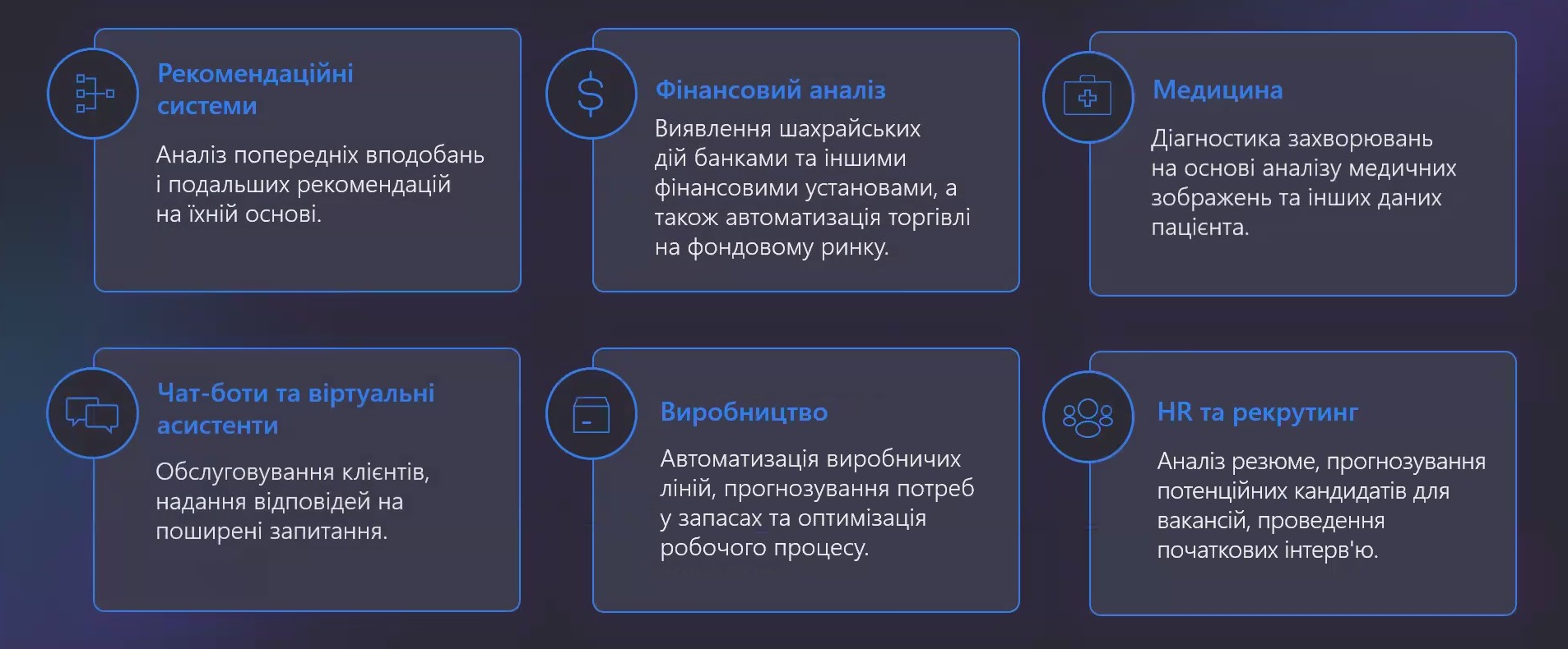 Також ШІ може використовуватися в рекомендаційних системах, маркетингу, для виявлення шахрайства побудови клієнтського сервісу через чат-боти тощо. Навіть в царині HR штучний інтелект може надати неабияку допомогу.