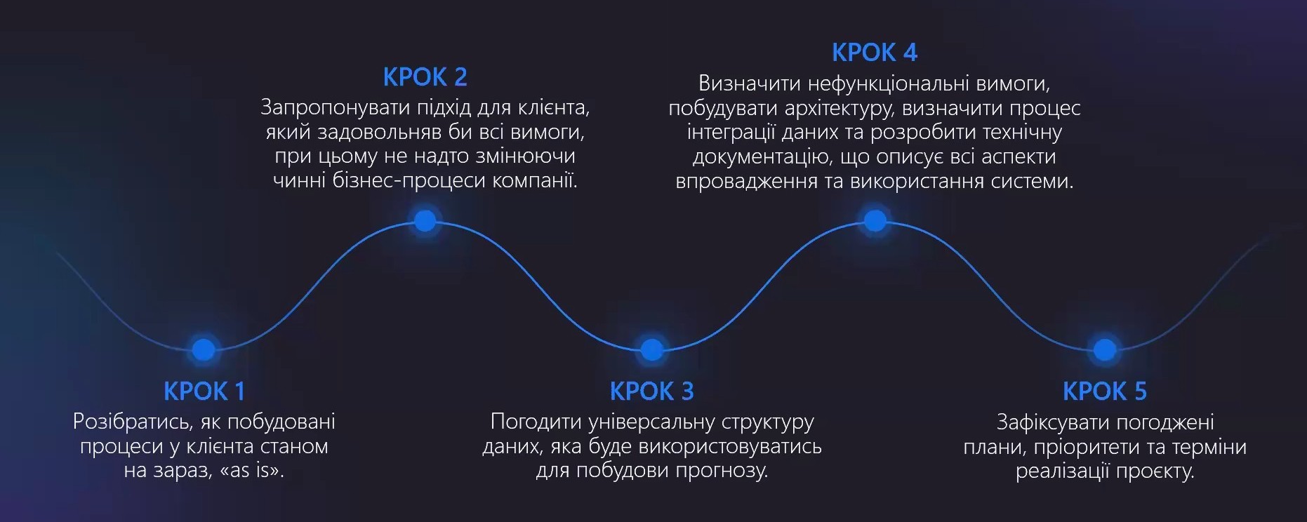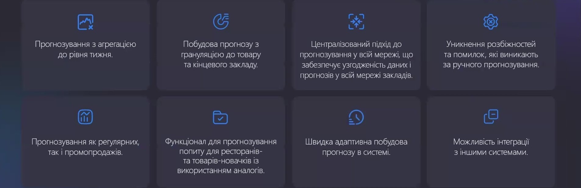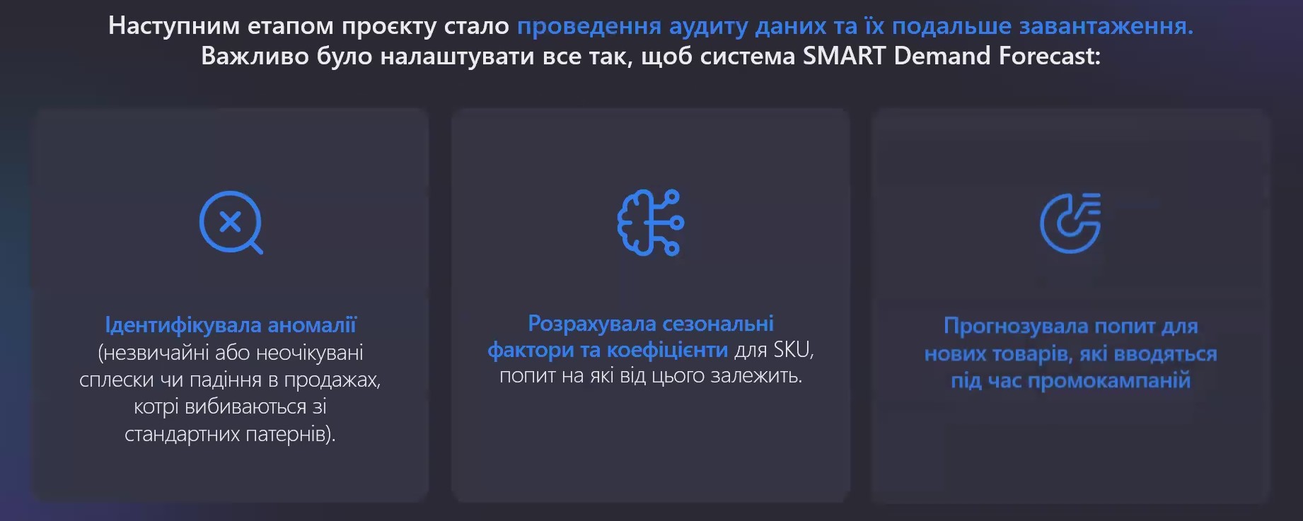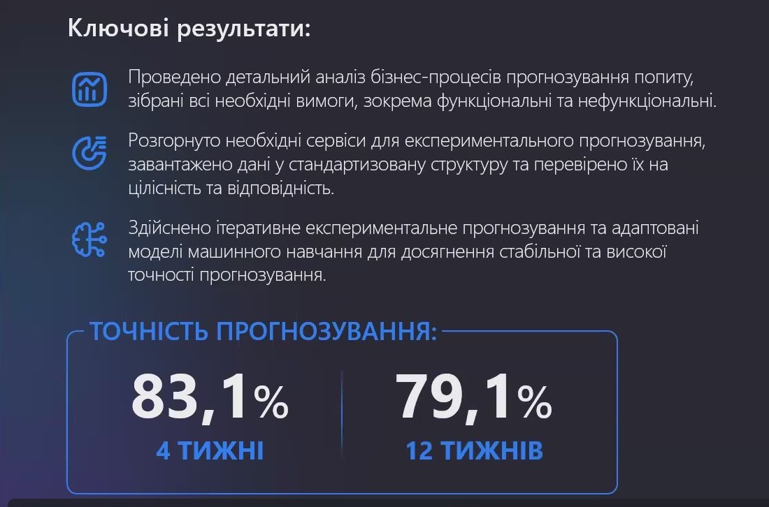 Також важливою була централізована обробка інформації, а не в окремих файлах кожного аналітика. Щоб його відсутність (наприклад, через хворобу) не позначалася на роботі інших. Окрім прогнозування як регулярних? так і промо продажів, система мала би надати можливість при потребі спрогнозувати попит не через тиждень, а наприклад, через день. Ключовою метрикою успішності проєкту було досягнення точності прогнозування від 70 до 80% з урахуванням основних вимог.