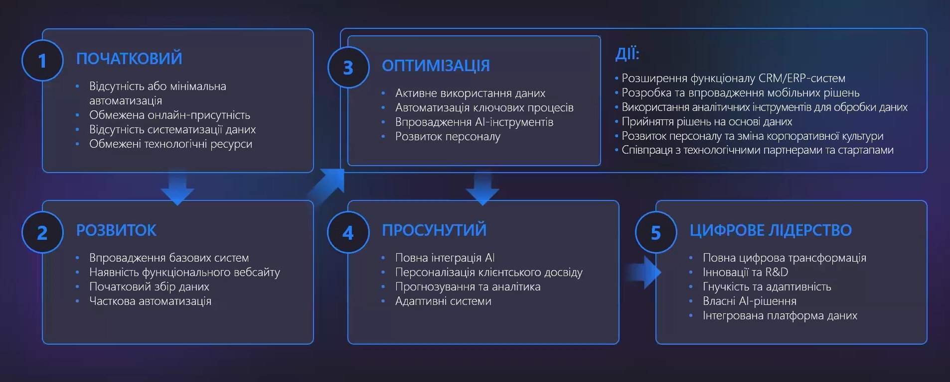 І тільки отримавши перші здобутки завдяки ШІ, компанія переходить на етап технологічної зрілості. Коли ШІ задіяний в більшості процесів, активно задіяні процеси прогнозування та аналітики. На останньому етапі компанія має вже власні розробки у сфері ШІ, за його допомогою аналізує та покращує бізнес-процеси, а також має єдину інтегровану платформу даних, що разом дозволяє досягти цифрового лідерства.