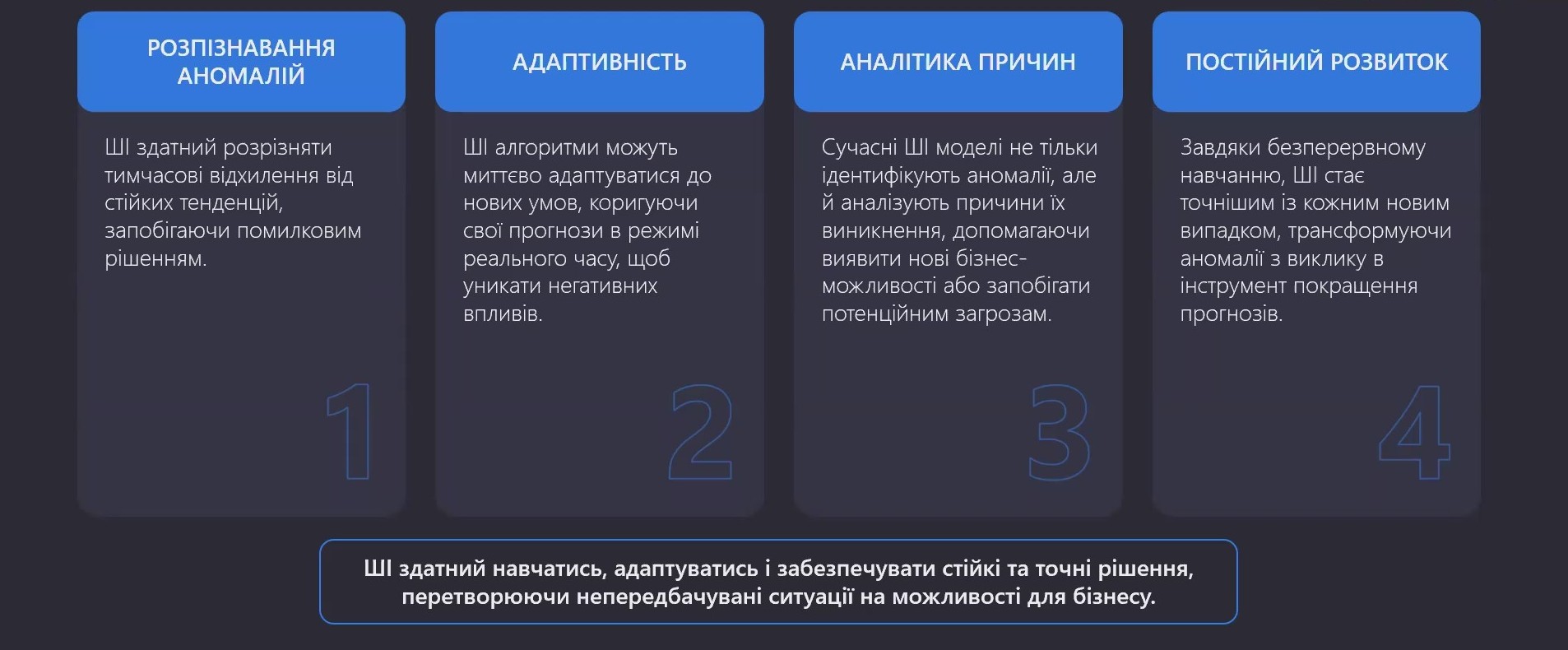 Наприклад, у кіоск з хот-догами завітала спортивна команда, що проїздила повз, і створила аномальний попит. Такі відхилення треба використовувати для навчання моделі ШІ аби покращити результати прогнозування. Оскільки умови ведення бізнесу постійно змінюються, виявлення, адаптацію та аналіз причин аномалій треба робити постійно. Тоді ШІ зможе забезпечувати стійкі та точні рішення, перетворюючи непередбачувані ситуації на можливості для бізнесу.