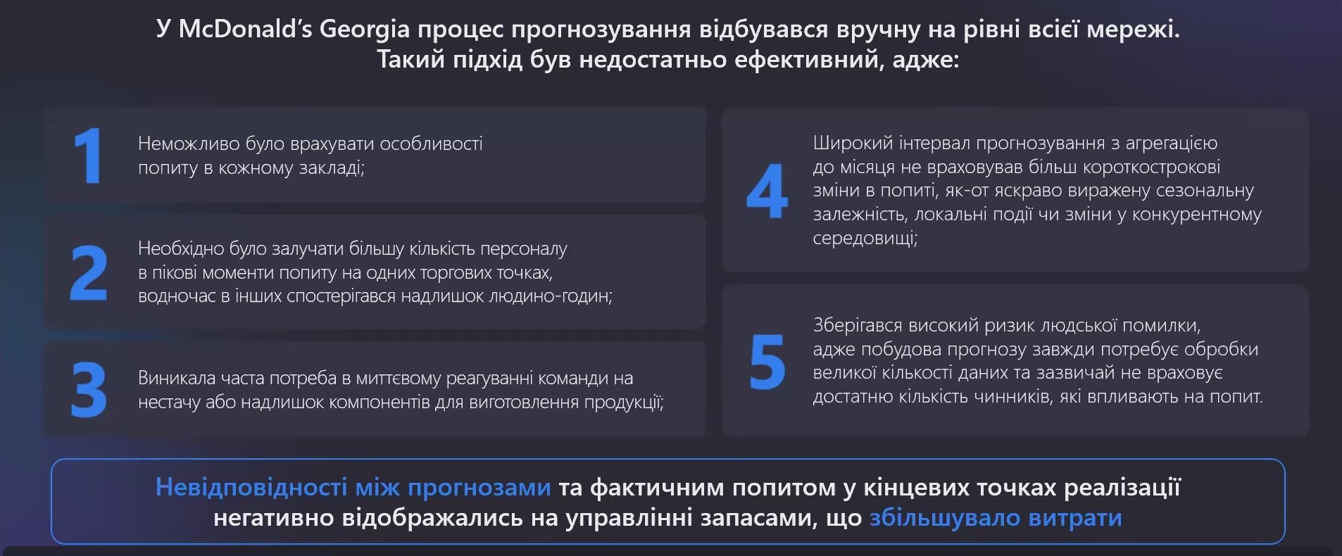 Компанія McDonalds Georgia стикнулася з тим, що прогнозування робилося на рівні всієї мережі, без врахування особливостей попиту в кожній конкретній локації в різних точках країни. Невідповідності між прогнозами та фактичним попитом у певних ресторанах призводили до дефіциту наявних робочих рук та вимагав додаткового підвозу інгредієнтів, що знижувало ефективність роботи та збільшувало витрати.