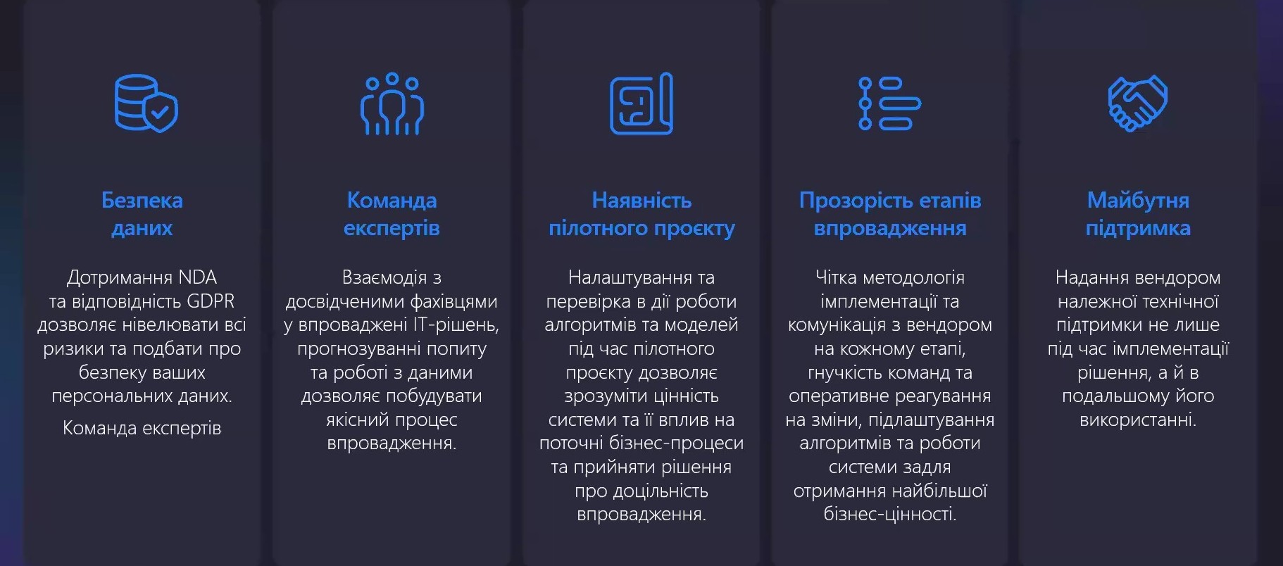 Серед головних вимог до вендора замовник зазначив обов’язкове дотримання безпеки даних, а також наявність пілотного проєкту. Щоб бізнес міг зрозуміти: чи виконує система поставлені задачі та прийняти рішення про доцільність впровадження.
