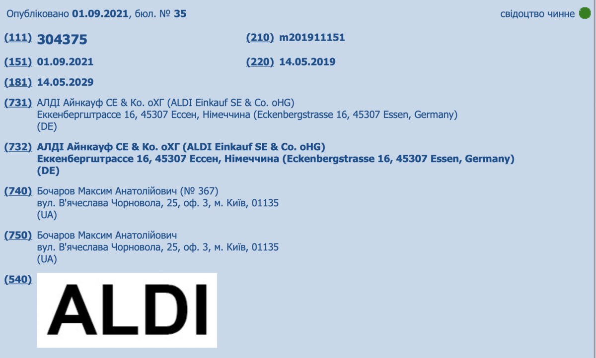 Німецька компанія ALDI Einkauf SE & Co. oHG – власник дискаунтера Aldi – зареєструвала товарний знак в Україні