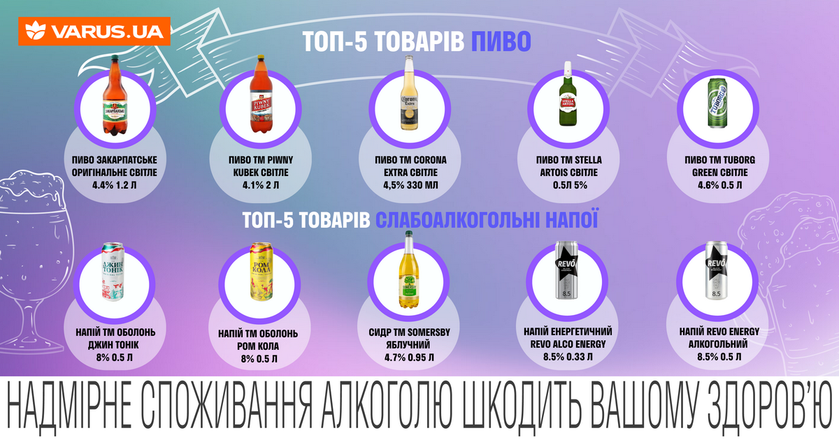 Категорії товарів “Пиво та слабоалкогольні напої” є досить популярною у клієнтів на varus.ua. Які саме товари найчастіше обирають українці в цих категоріях, розглянуто детальніше нижче.