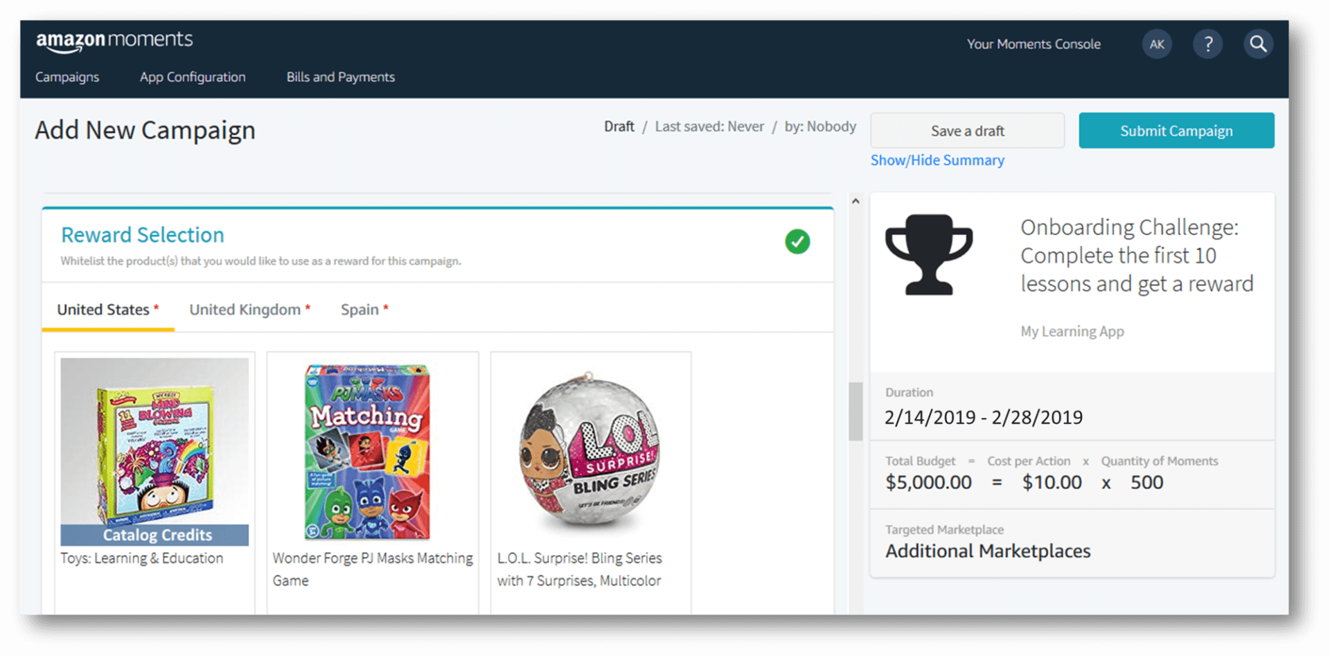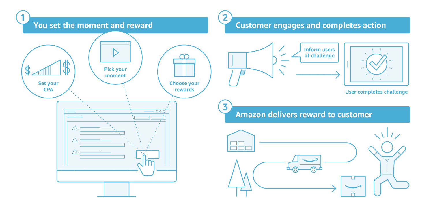 - Магазин, виробник або будь-яка інша компанія, що надає товари або послуги, розміщує на своєму сайті або в мобільному додатку завдання (названі moments – «моменти»), які повинен виконати користувач, і вибирає винагороди, пропоновані за успіх. Компанія сама вирішує, де і як на сайті клієнти побачать повідомлення Amazon Moments із завданнями. Крім того, за допомогою багатофункціональної консолі Amazon Moments власник сайту може адресно налаштовувати завдання для різних груп користувачів. Так, якщо відвідувач сайту вже підписаний на розсилку, він не побачить завдання «підписатися на новини», а отримає інший «момент», наприклад, пройти опитування та ін.